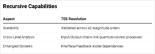 The 7ES Framework's recursion capability—where every Element is a subsystem—resolves the nested systems paradox and establishes a foundation for quantitative cross-scale integration. Future work will formalize recursion metrics and expand validation to AI-generated systems.