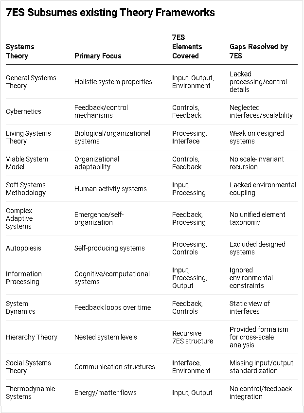 The 7ES Framework integrates and extends 12 canonical systems theories, resolving their limitations through recursive universality.