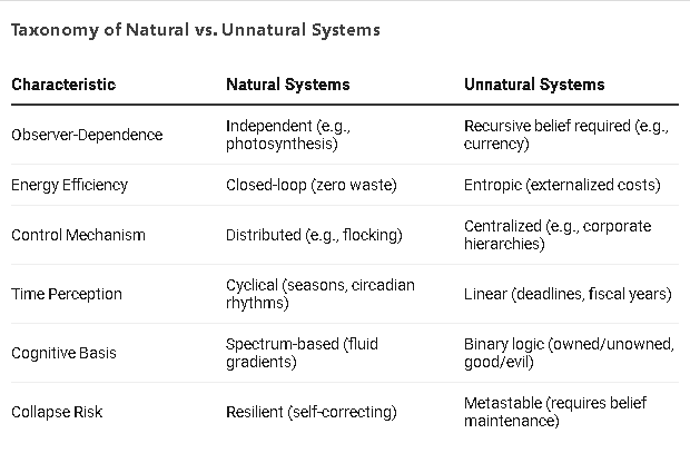 Humanity uniquely constructs and maintains systems that defy evolutionary logic—capitalism, punitive legal frameworks, and digital abstractions—all reliant on recursive belief . These "unnatural systems" (see Table 1) contrast with natural systems, which persist without observer participation (e.g., photosynthesis, predator-prey cycles). This paper posits that unnatural systems are metastable byproducts of PFC overclocking (Gazzaniga, 2018), inherently fragile due to their violation of fractal reality and thermodynamic efficiency.