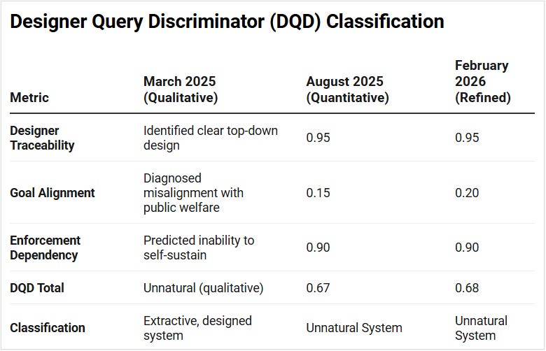 The temporal progression from March 2025 intuitive essay through August 2025 framework audit to February 2026 comprehensive forensic analysis demonstrates that different analytical approaches converge on similar conclusions when examining genuinely flawed systems. DOGE’s design violations were sufficiently severe that operational expertise, initial framework application, and exhaustive documentation all independently identified collapse-prone characteristics.