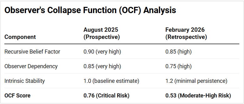 August 2025: Calculated Observer’s Collapse Function (OCF) = 0.76, indicating critical collapse risk within 6-12 months.