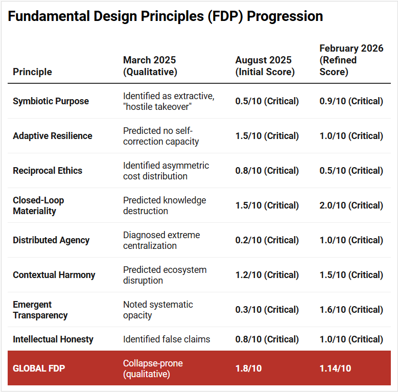 February 2026 (Forensic): Refined Goal Alignment to 0.20/10 with comprehensive documentation of extractive outcomes versus stated efficiency objectives.