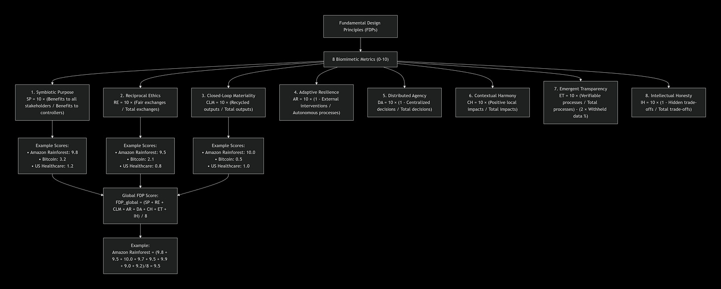 Fundamental Design Principles (FDPs) Eight quantitative metrics (0-10 scores) that translate 3.8 billion years of evolutionary intelligence into measurable ethical principles for evaluating how well human systems align with nature’s proven design logic. Unlike abstract sustainability frameworks, FDPs provide biomimetic benchmarks for system ethics and sustainability.