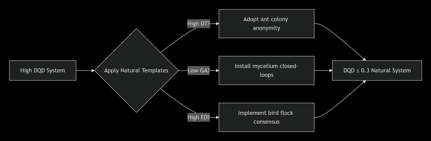 Biomimetic Repair Protocols are structured intervention strategies derived from natural system design patterns that address specific deficiencies identified through Fundamental Design Principle scoring. These protocols translate the operational architecture of natural systems that demonstrate high viability and resilience into actionable repair pathways for human-designed systems exhibiting dysfunction or collapse risk.