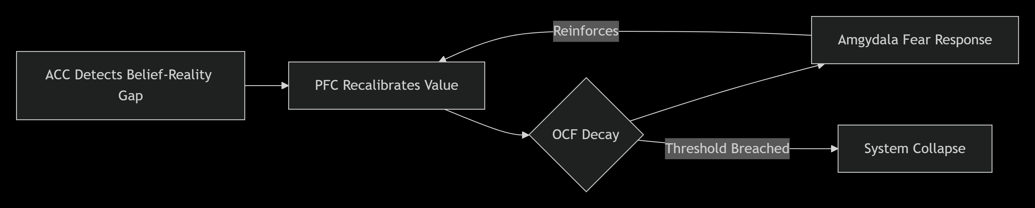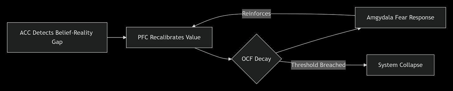 Anterior Cingulate Cortex (ACC) Brain region that detects belief-reality conflicts, important for understanding how contradictions between belief and experience can trigger system collapse.