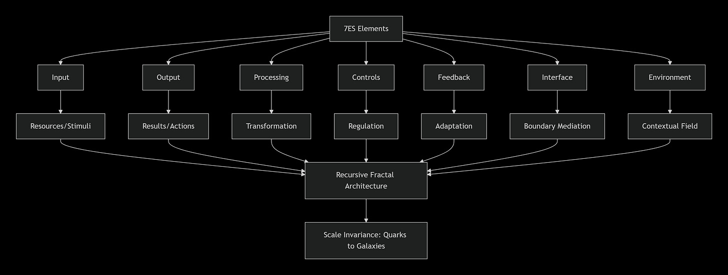 1. The 7ES Framework: Provides the structural foundation—recursive, fractal analysis that reveals how systems work across 61 orders of magnitude.