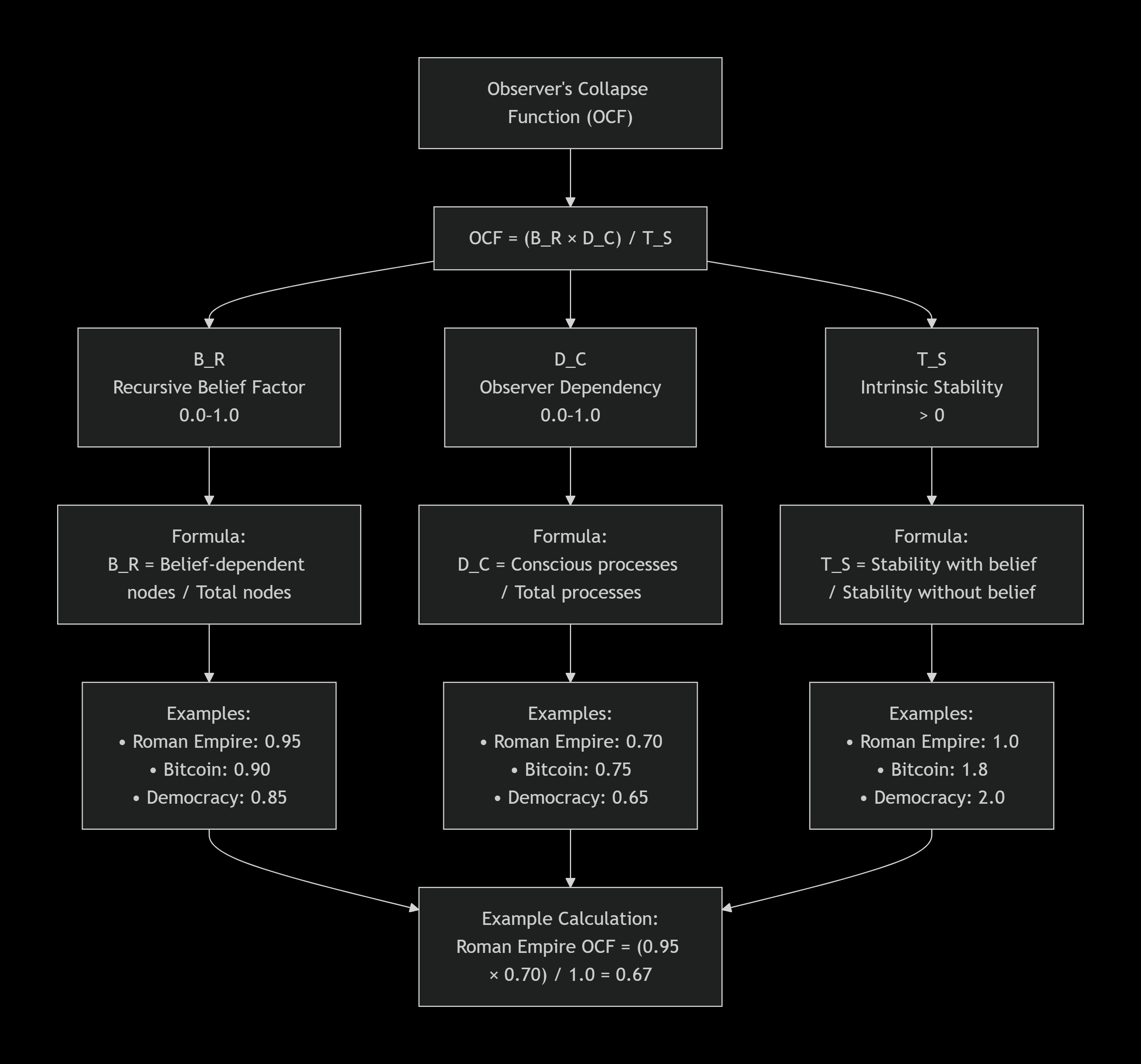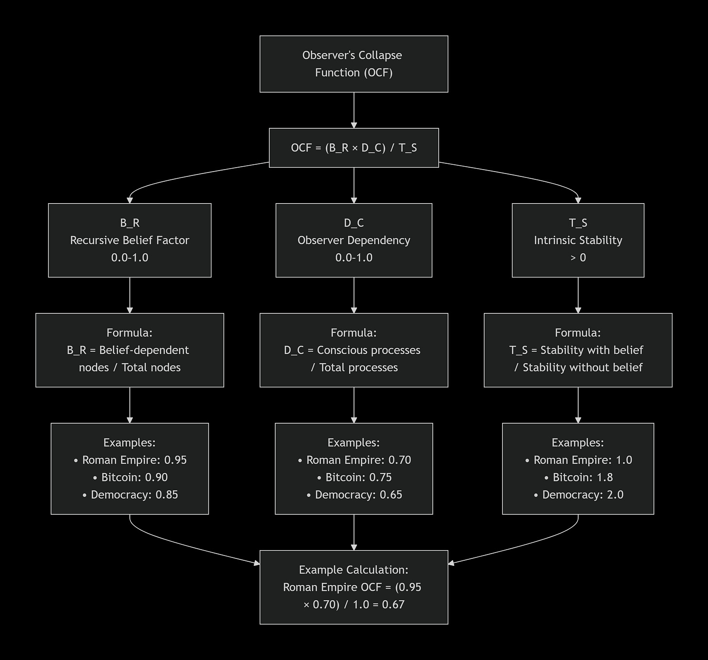 Observer’s Collapse Function (OCF) A framework for predicting system fragility through belief dependency. OCF addresses which systems exist independently of human belief and which collapse when people stop believing in them. While photosynthesis continues regardless of opinions, currencies, corporations, and governments exist only as long as observers maintain belief in their reality and value.