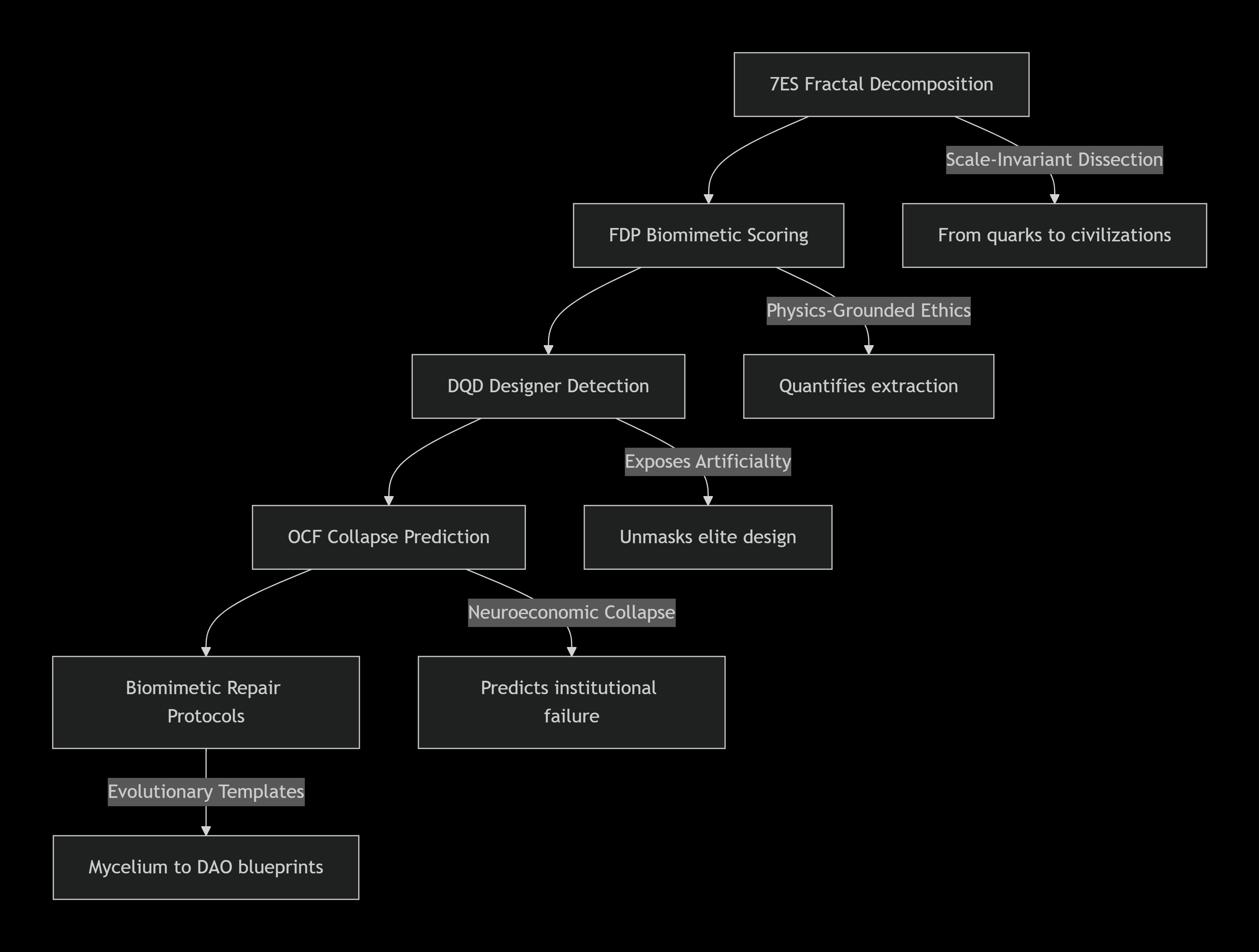 Collapse Risk Assessment Integration of OCF vulnerabilities with structural (7ES), ethical (FDP), and authenticity (DQD) analyses to predict comprehensive system failure probabilities.
