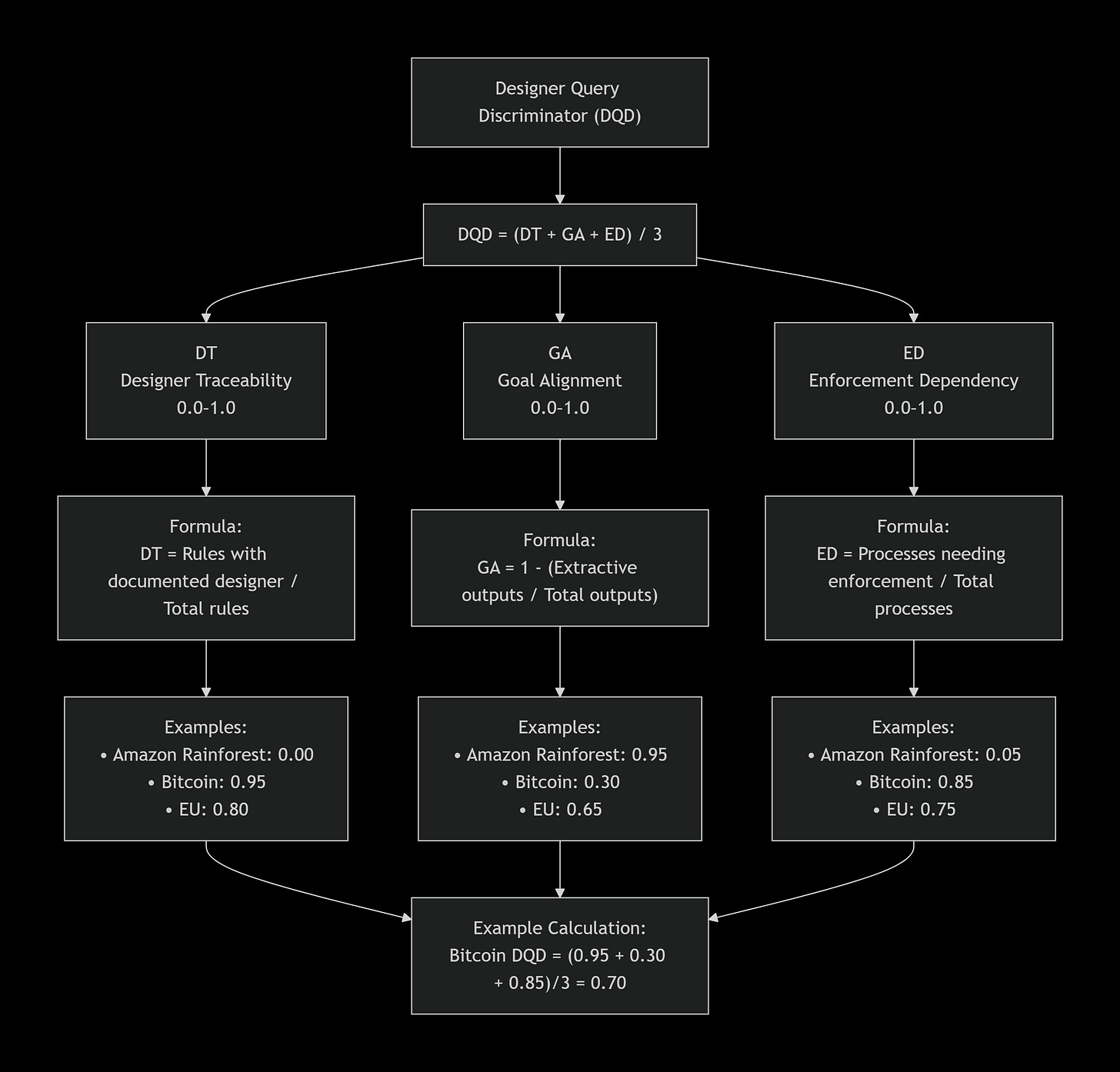 Designer Traceability (DT) Quantifies how much of the system was externally imposed versus emergently developed. Formula: DT = (Designed Rules + External Constraints) / Total System Features. Enhanced formula with consciousness: DT = 0.25 × Bio-consciousness + 0.75 × Documented design