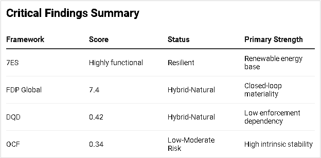 Iceland demonstrates characteristics of a Hybrid system transitioning toward Natural (FDP Global = 6.4) with exceptional performance in environmental sustainability and democratic governance, but with critical vulnerabilities in economic observer dependency and fiscal sustainability. The system shows remarkable alignment with natural principles while maintaining necessary institutional structures.
