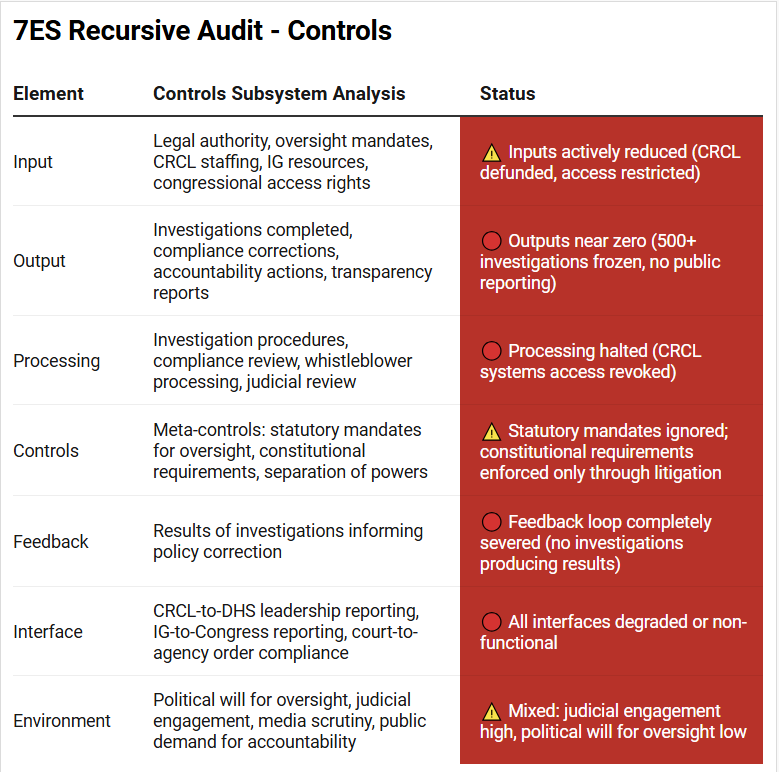 Structural Assessment: Controls are severely degraded and approaching systemic failure. The dismantling of internal oversight (CRCL), obstruction of congressional access, and documented defiance of court orders represent a control architecture in which the only remaining effective constraint is federal judiciary intervention—and even that constraint is being tested. When a system’s own internal watchdog is shuttered, its legislative overseers are blocked, and its responses to judicial orders are characterized by non-compliance, the control element is not merely weak but is actively being dismantled by design.