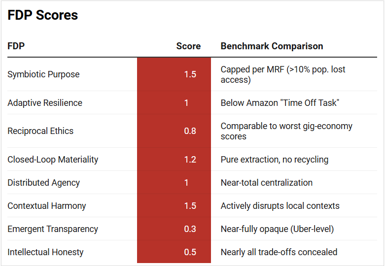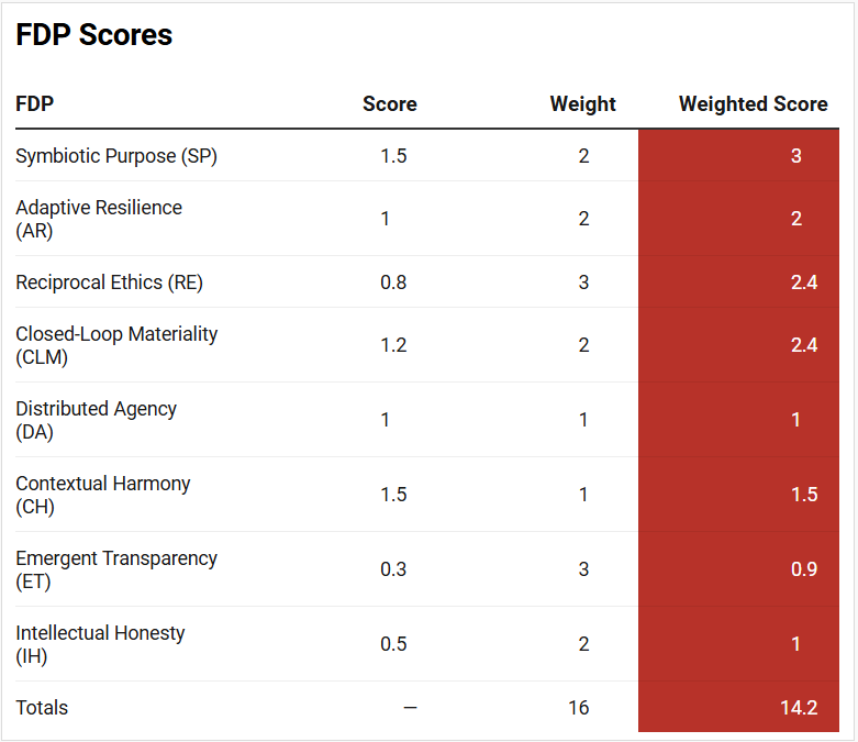 Per MRF thresholds, a score below 5.0 classifies the system as Unnatural and collapse-prone. At 0.89, this system scores in the extreme lower range—below the MRF’s Amazon “Time Off Task” algorithm example (RE=1, ET=0) when aggregated. The weakest FDPs are ET (0.3) and IH (0.5), both of which carry heavy weight in the governmental dimension.