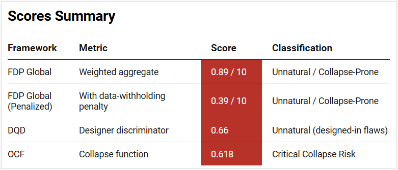 The system scores 0.89 / 10 on the FDP Global metric (0.39 penalized), classifying it as Unnatural and Collapse-Prone — the lowest tier in the MRF classification schema. It scores 0.66 on the DQD, confirming that its structural failures are not emergent byproducts of complexity but designed-in features traceable to specific actors executing a documented policy blueprint. It scores 0.618 on the OCF, placing it at Critical Collapse Risk — sustained not by intrinsic stability or operational coherence but by recursive political belief that is under measurable and accelerating erosion.