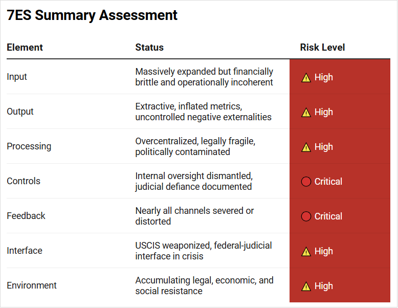 Structural Assessment: Processing is dangerously overcentralized and legally fragile. The concentration of strategic decision-making in the White House Border Czar position (which is not Senate-confirmed and not subject to congressional oversight) creates a single point of failure. The acceleration of removal processing through expedited removal expansion has generated dozens of federal court injunctions, meaning the system’s core processing mechanism is under active legal challenge. The dual-purposing of USCIS benefit interviews as enforcement traps undermines the integrity of the legal immigration system and deters lawful applicants—a processing design that actively degrades the broader immigration system’s function.