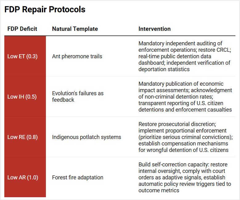 1. The system is Unnatural by every metric. FDP, DQD, and OCF all classify DHS immigration enforcement under Noem as an unnatural system — designed by identifiable actors, serving narrow interests, dependent on external enforcement, and prone to collapse.